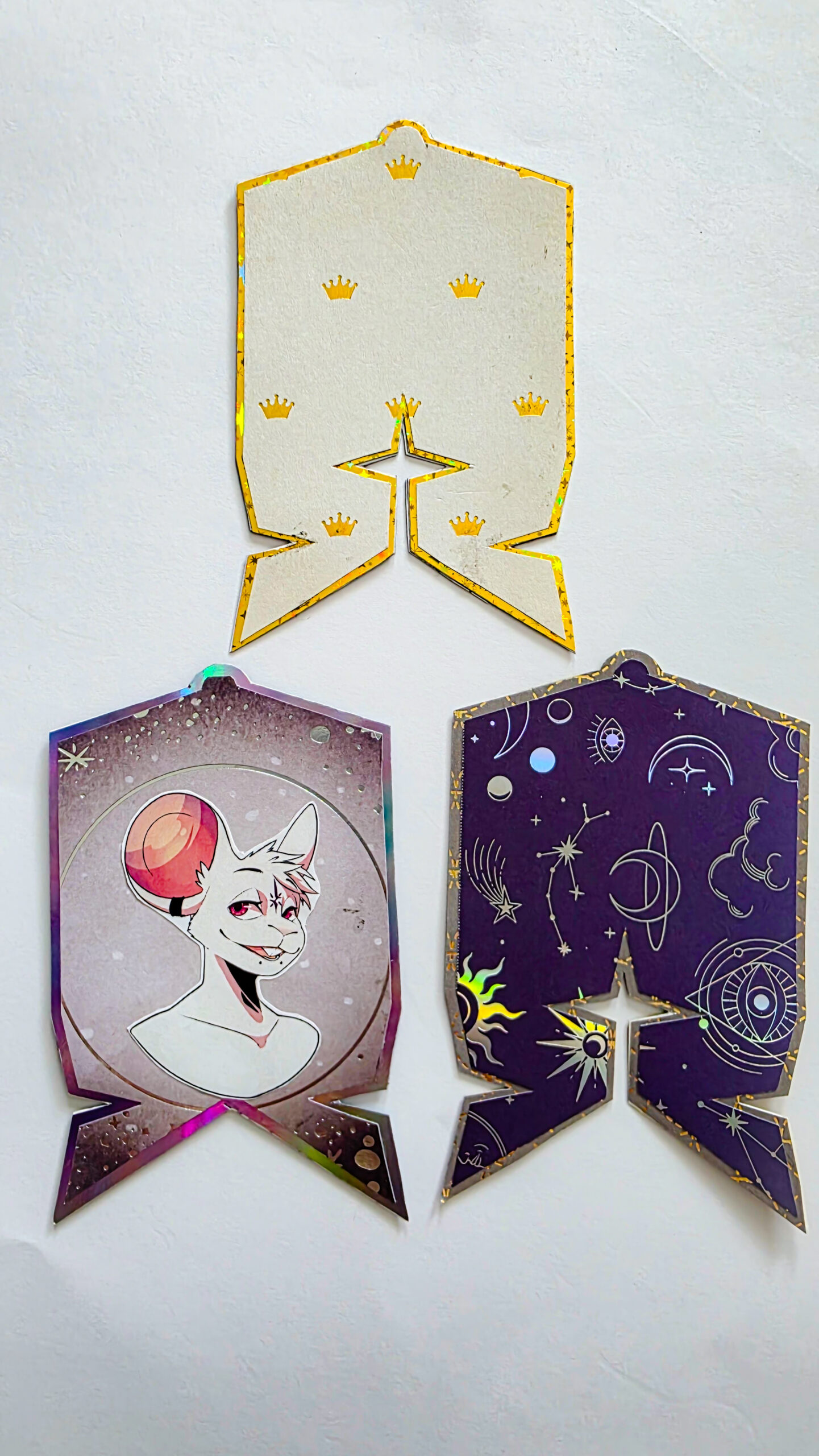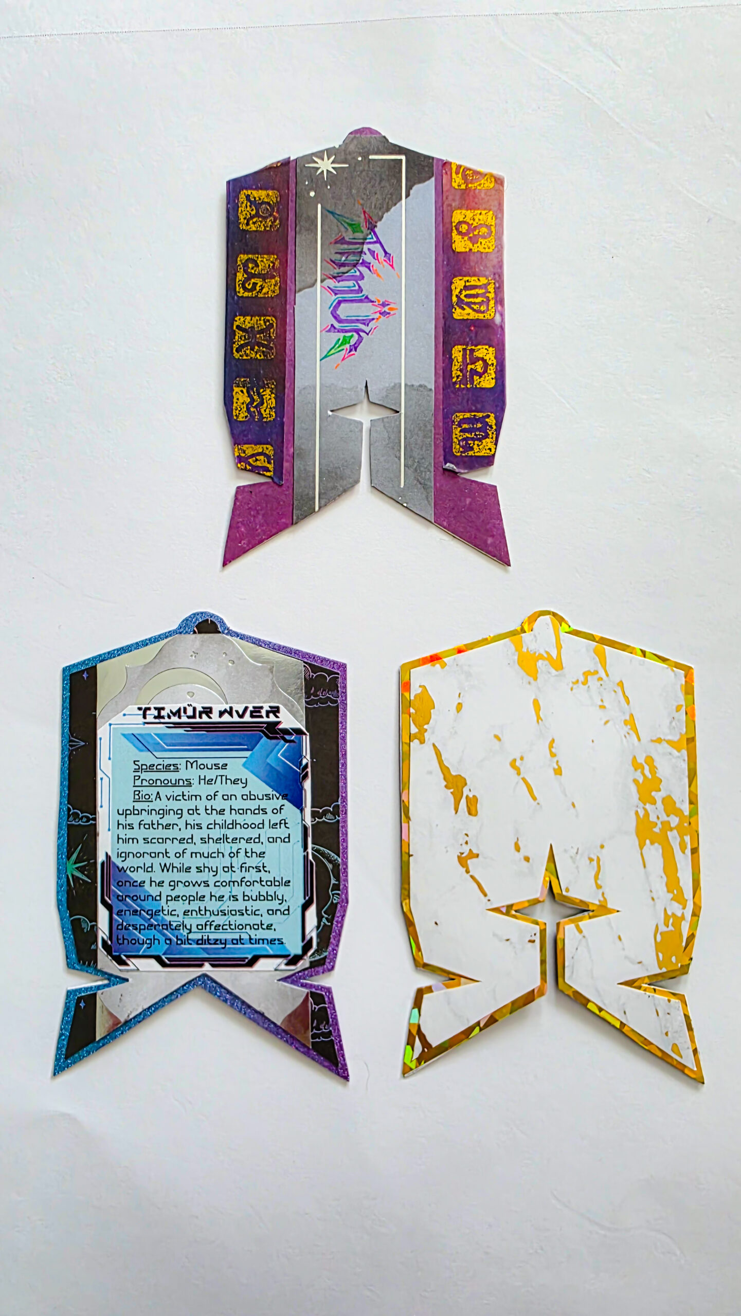 These tags are combined creation from Ollie Comics and Azelian founder Reks! Each tag comes with a set of 3 layers, crafted from a collection of durable paper material in a wide variety of designs. When a commission is placed, our team will collect information on preferences for color, accents, and theme, or work off artistic freedom to match materials to the style and color palette of your character.