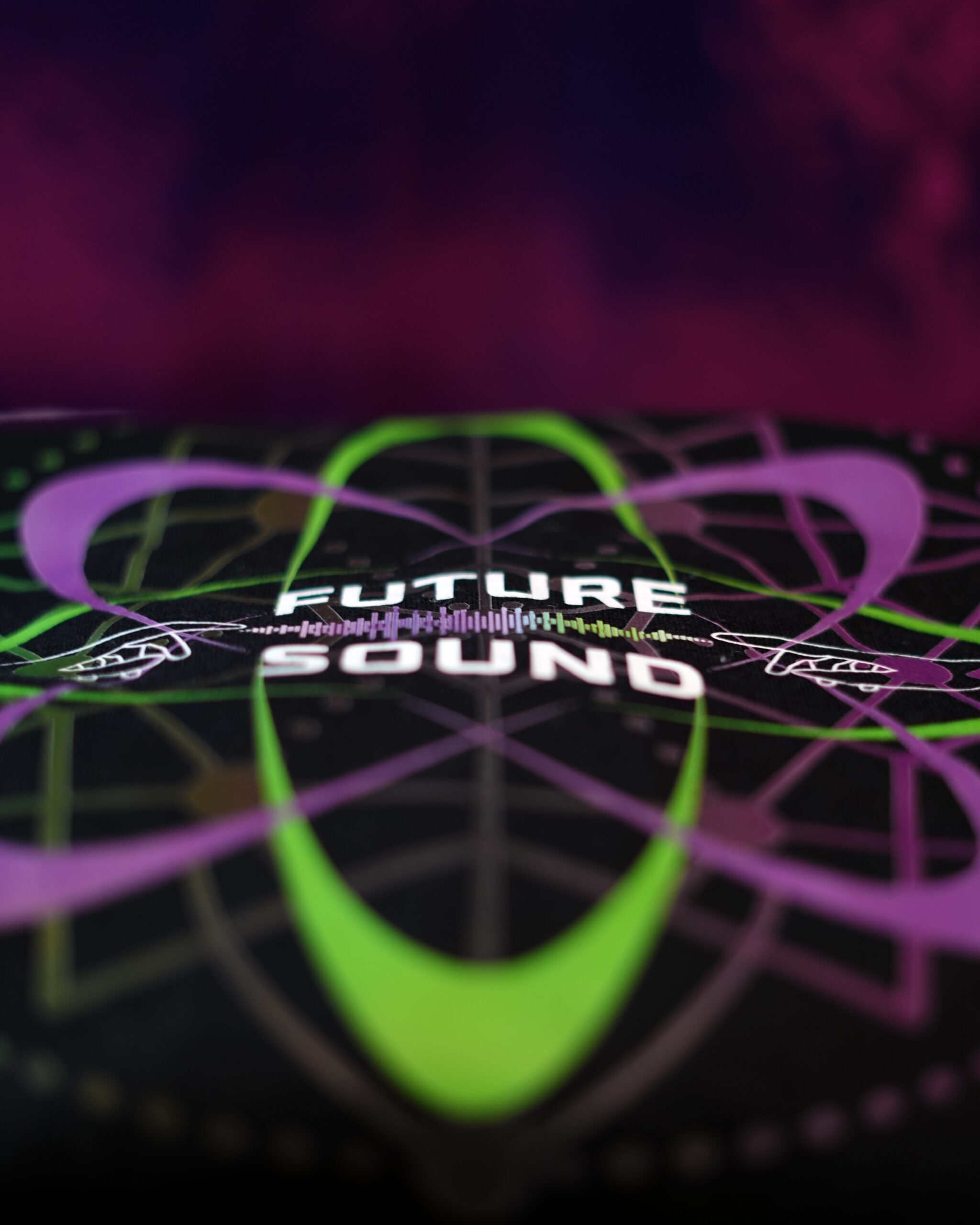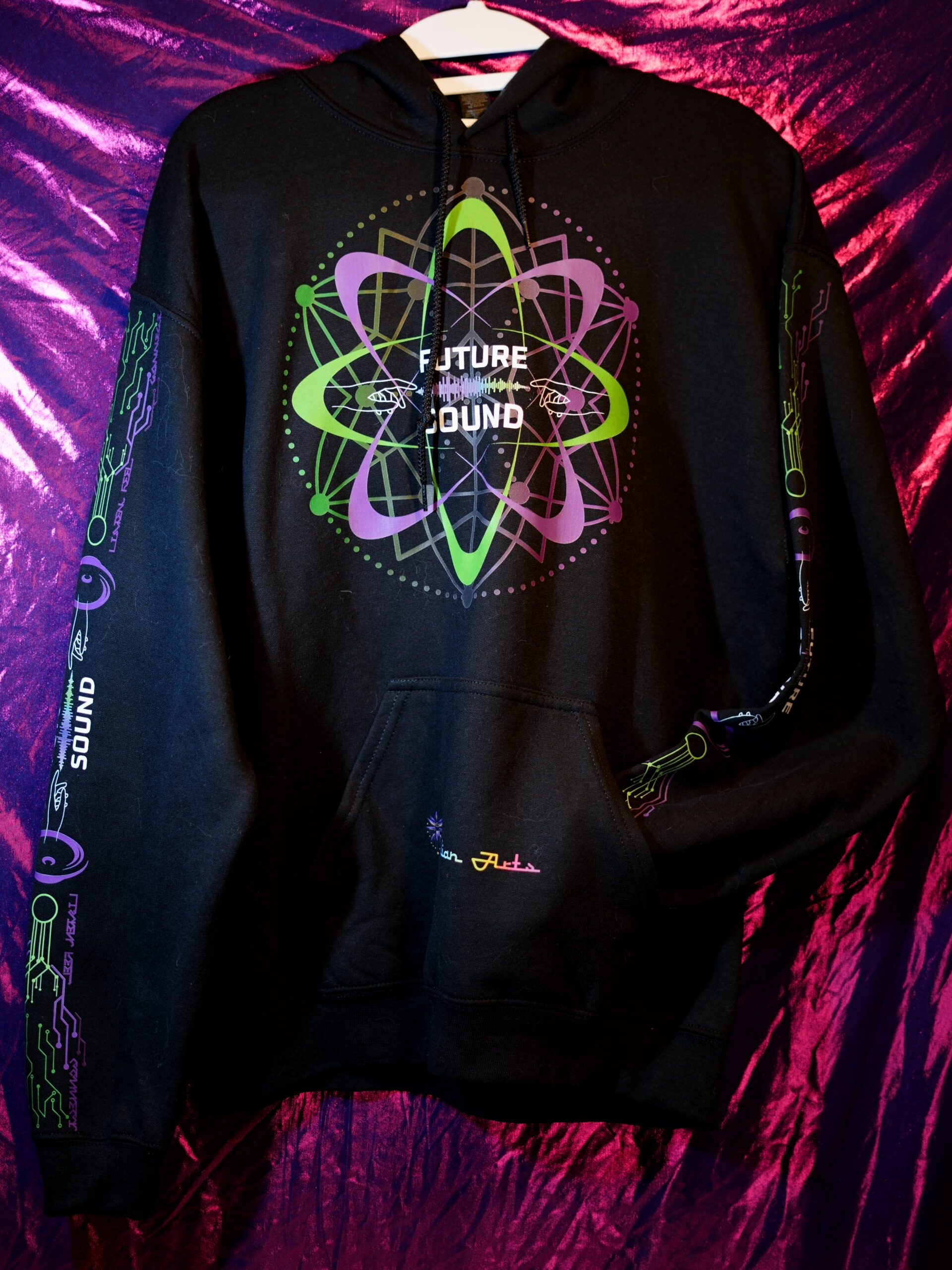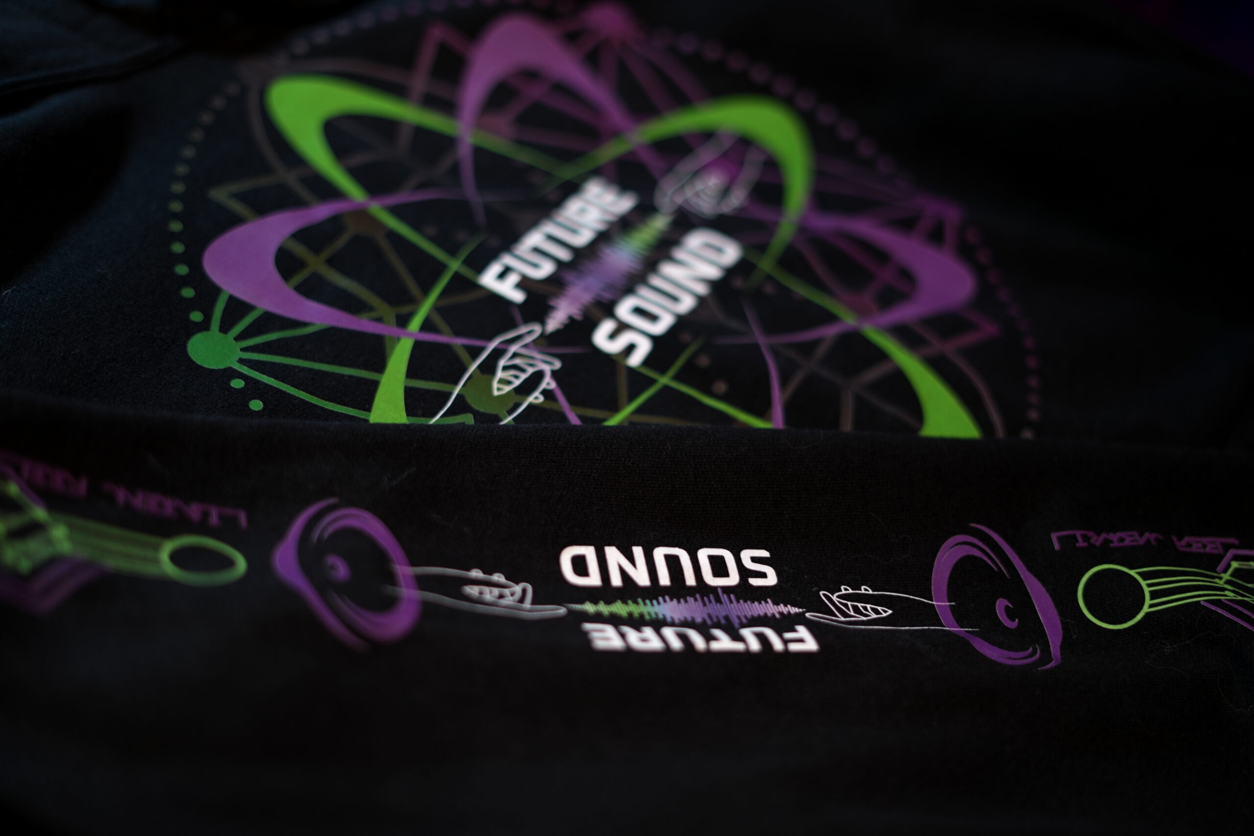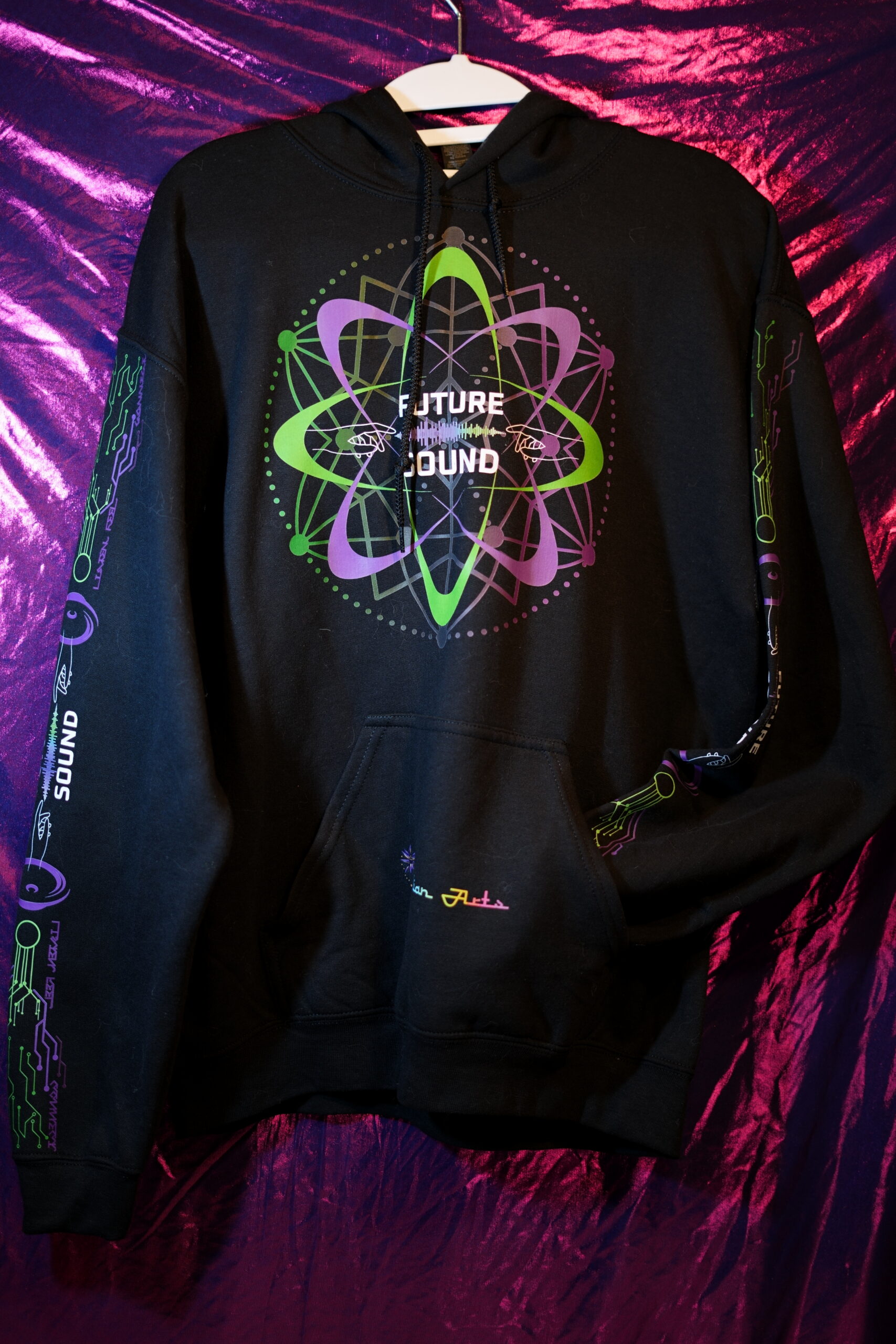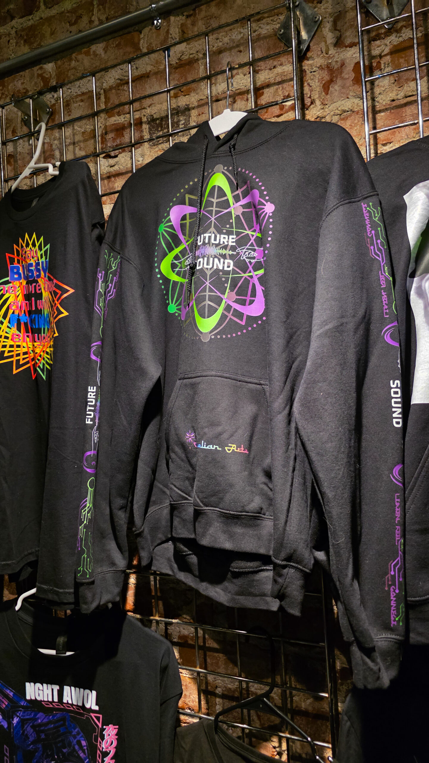 While our current photo only showcases the hoodie version, this design is available in Hoodies, T-Shirts, and Hooded Crop Tops. Long-sleeved designs come branded on the sleeves with the Future Sound logo and interwoven circuitry, along with the motto “Listen, Feel, Connect”. Short-sleeved designs feature a shortened version of this circuitry pattern.